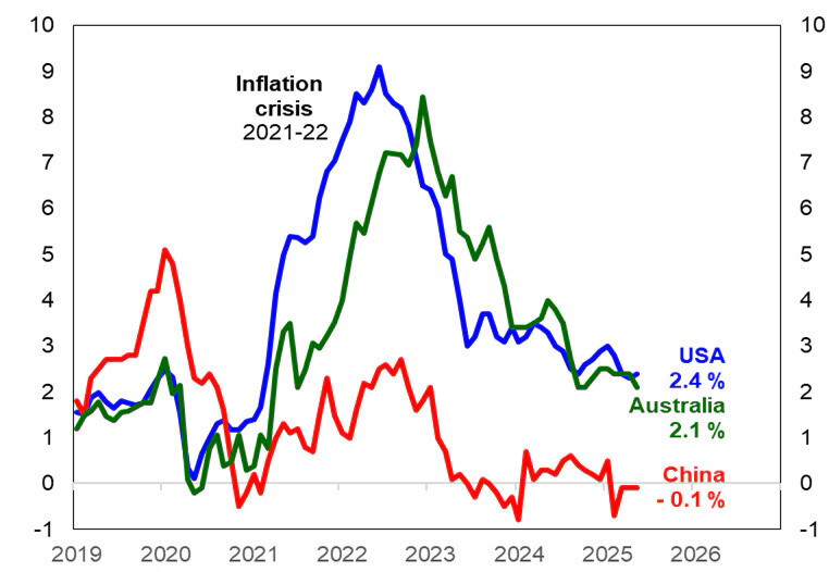 Global inflation has gradually fallen in the past year (Chart 2). Milder price rises for consumer goods such as clothing and electrical equipment have kept inflation in check. Notably inflation in both Australia and the US has fallen from above 3% in mid-2024 towards the low 2% inflation levels in mid-2025. China as the ‘factory to the world’ in producing consumer goods has been a source of this lower global inflation as well as experiencing its own minimal inflation given modest economic growth.
